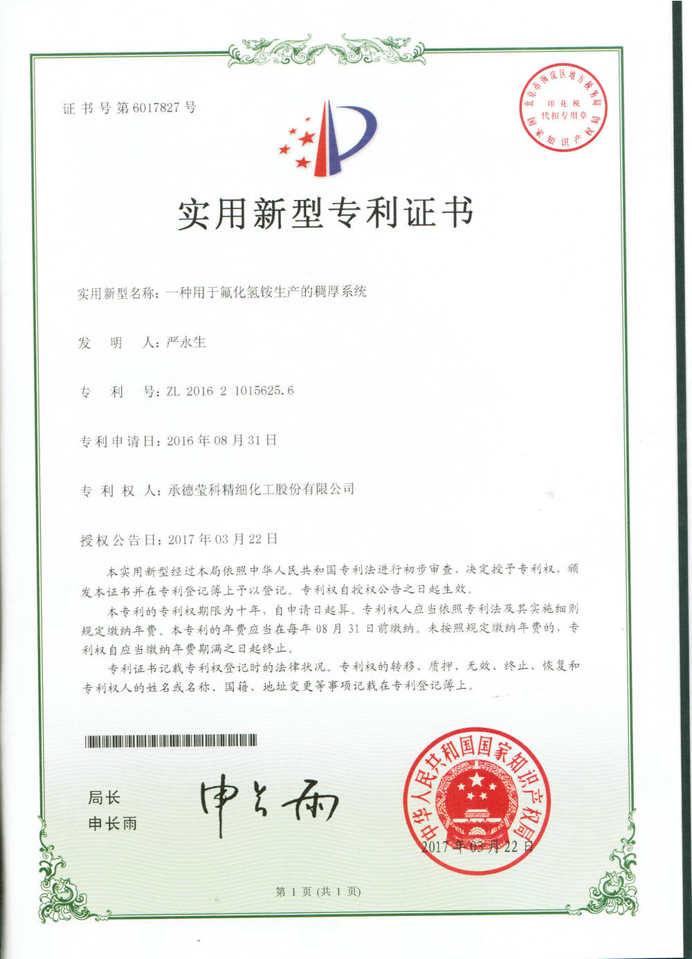 Patent certificate for utility model(Ammonia hydrogen fluoride thickening system)