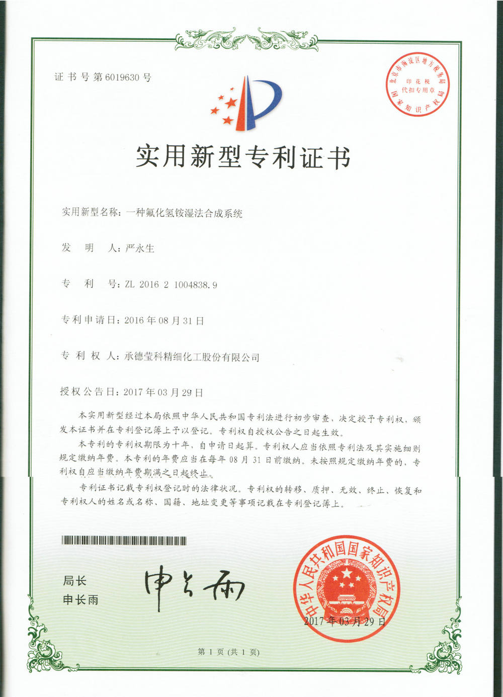 Patent certificate for utility model(Hydrogen fluoride ammonia wet synthesis)