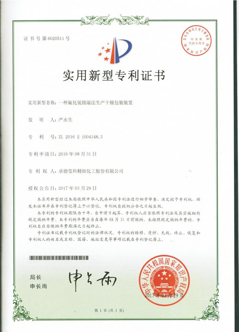 Patent certificate for utility model(Hydrofluoride ammonia wet production dry packaging)