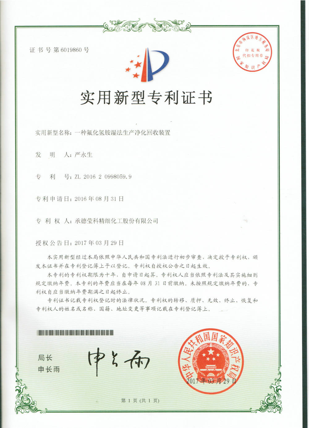 Patent certificate for utility model(Hydrofluoride ammonia wet production purification recovery)